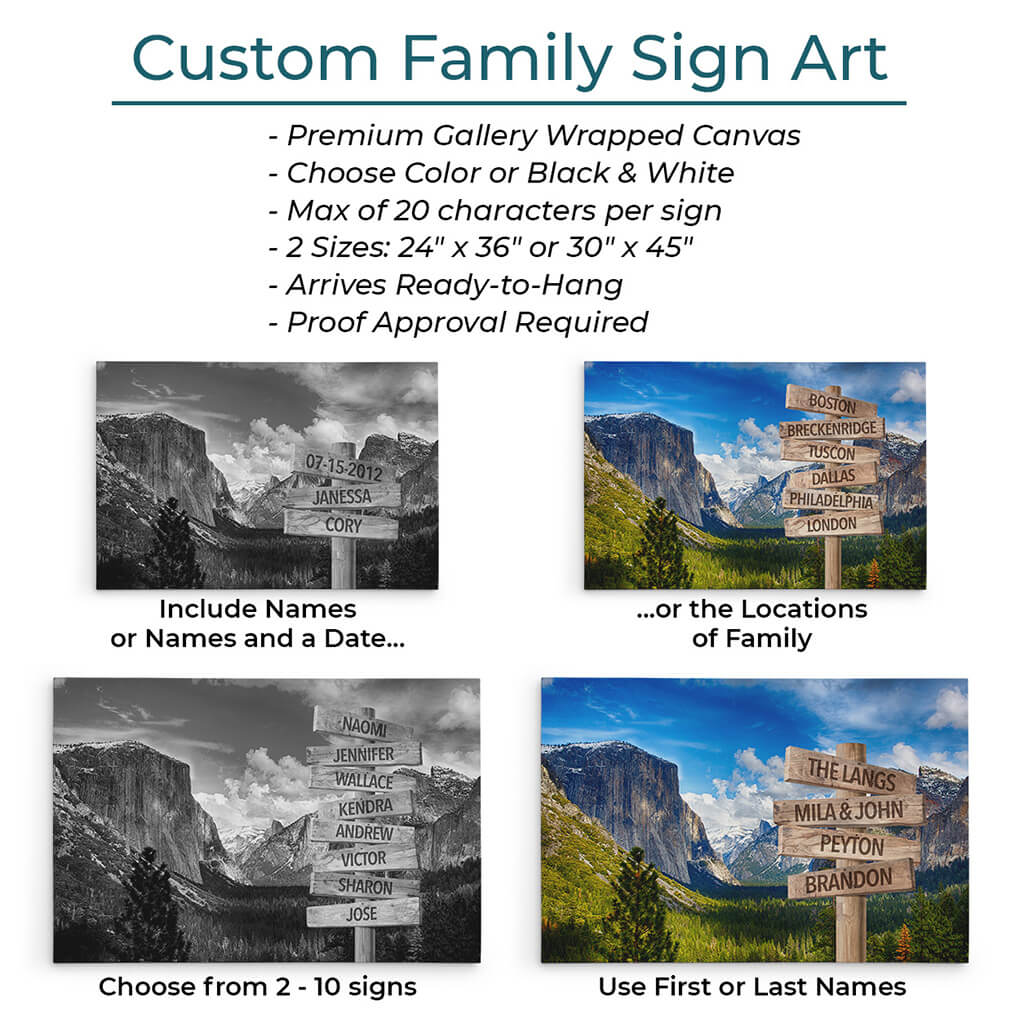 Showcase the names of your family members on this stunning family name artwork featuring the splendor of Yosemite National Park. Customize this Yosemite canvas print for families by adding the names of your loved ones to the signpost as a unique piece of art for your home or office. Alternatively, you could choose to display the city names where your family lives across the world. This vibrant Yosemite Valley wall art is printed on premium canvas in either eye-popping color or a more subtle black and white that is sure to match any décor. Show off your family pride by including up to 10 signs on your signpost. Makes a unique and sentimental gift for parents, grandparents and significant others to proudly show off their love for family!