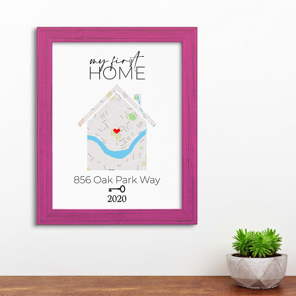 Owning a home is no small feat. Celebrate a loved one’s achievement of purchasing their first home with our First Home Map Print. Featured on this personalized housewarming gift is an outline of a house which has a map of the home’s location highlighted front and center. The words “My First Home” for an individual or “Our First Home” for a couple appear at the top of the print with either an address or a name(s) beneath the house. Lastly a year, and a key with either a rounded end or a heart shaped end, can be included at the bottom. We will print your First Time Home Buyers Map Art on premium canvas and frame your artwork in the solid wood frame of your choice. Makes a thoughtful, one-of-a-kind gift idea for the couple or individual in your life who purchased their first home, as a keepsake of their accomplishment!